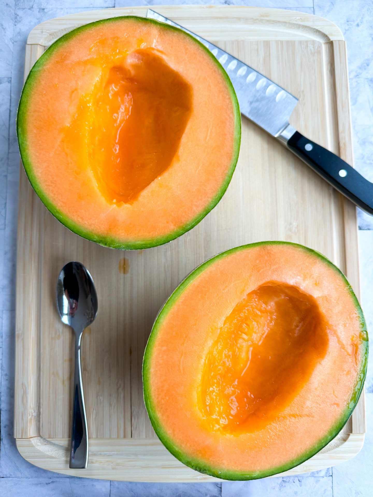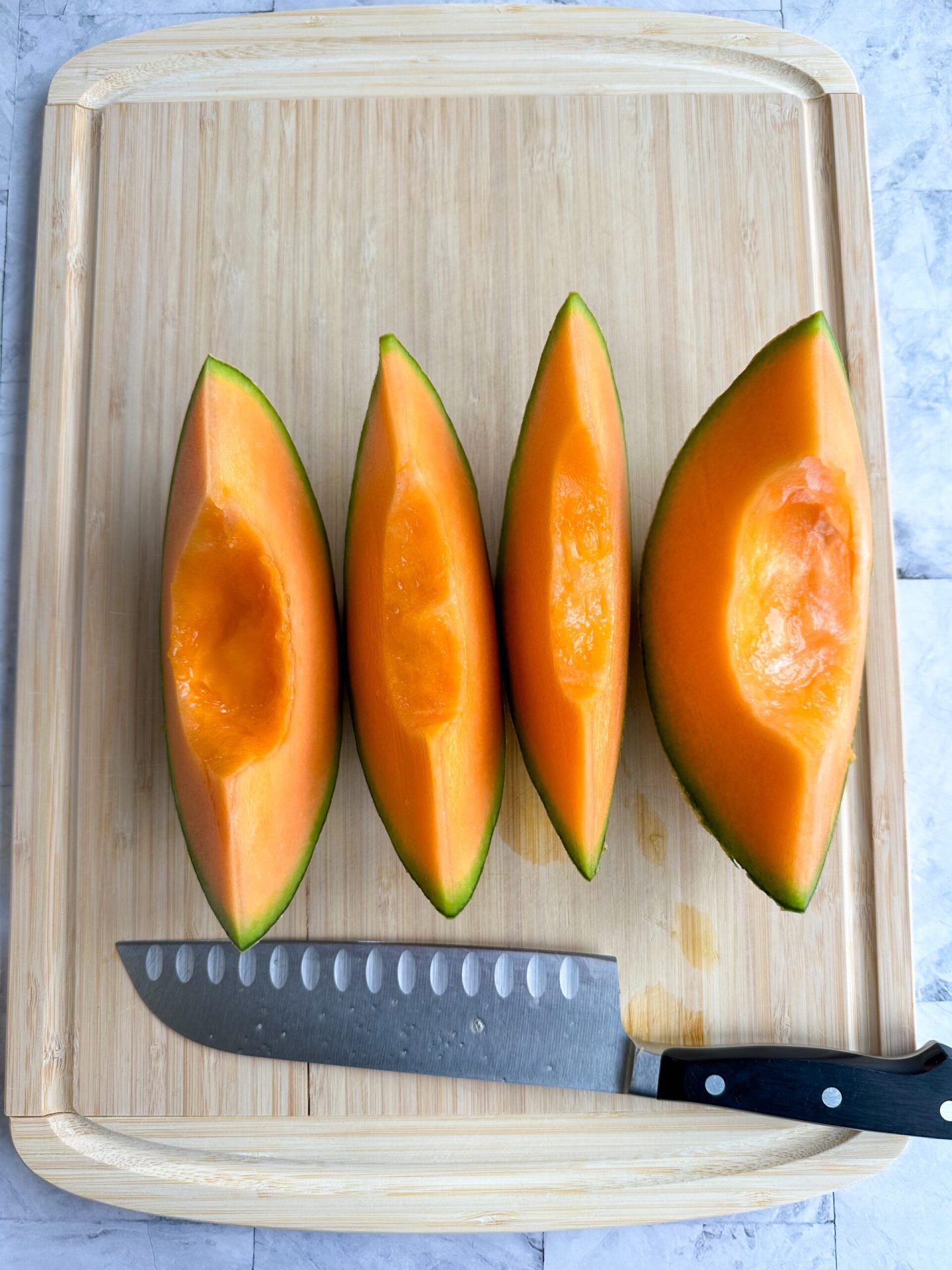 - Posiziona le metà del melone con la pelle rivolta verso l’alto per affettare più facilmente.