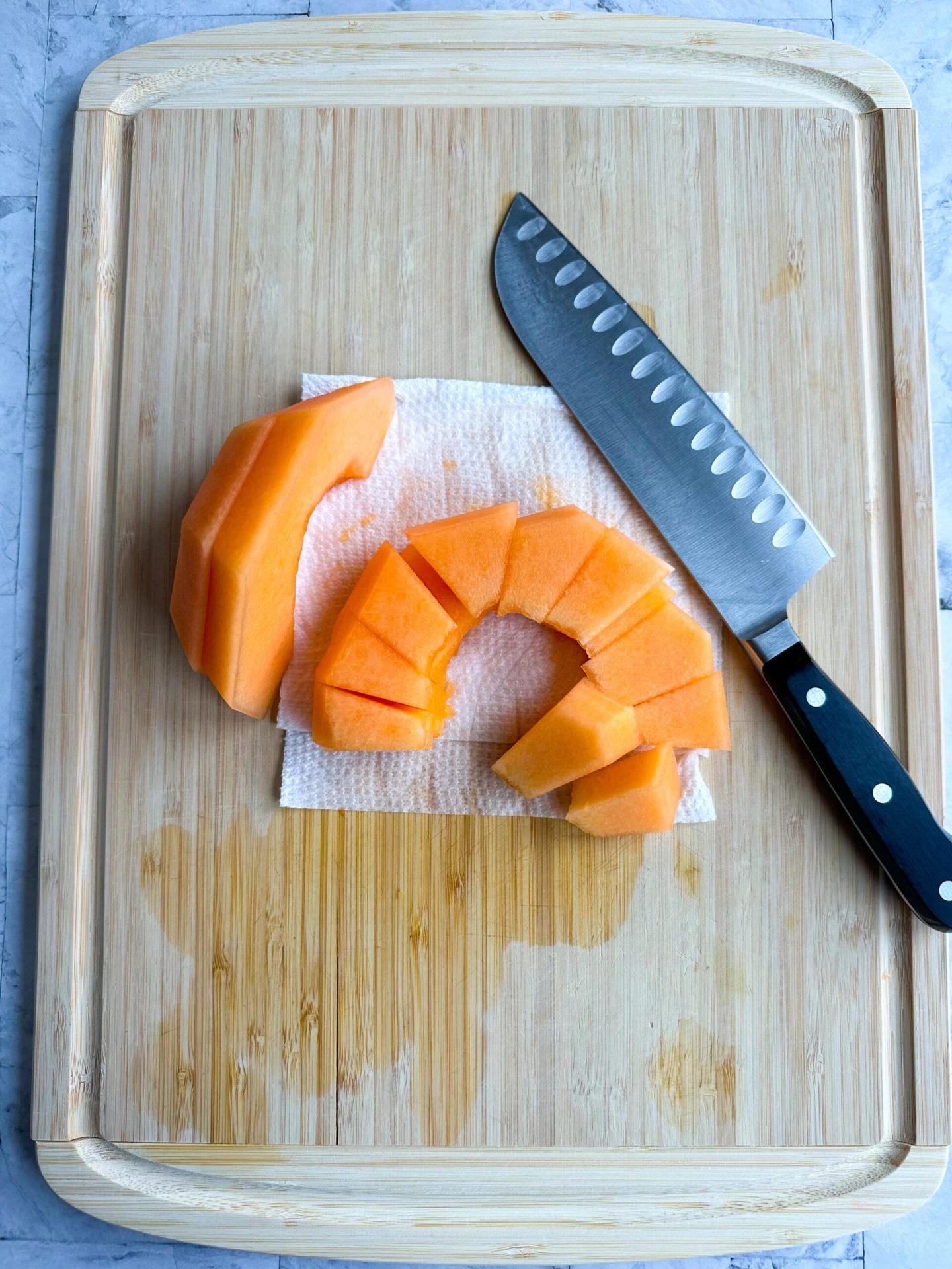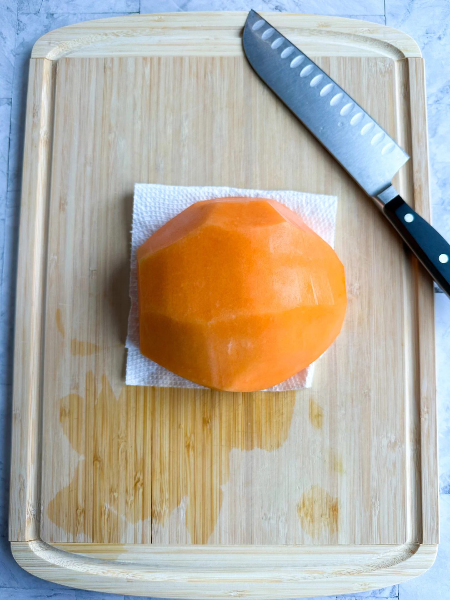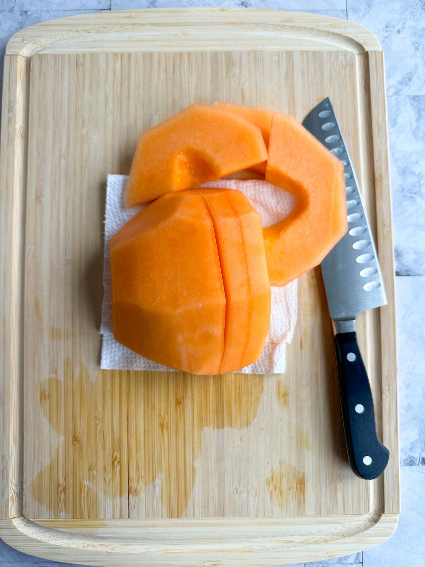 - Adagiare il melone sbucciato, con la parte larga rivolta verso il basso, sul tagliere.