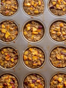 Adoriamo questi dolcetti di pesche al forno e farina d'avena alla crema! Hanno lo stesso sapore della farina d'avena istantanea che adoravo da bambino. Prepara questi pasti in anticipo: sono meravigliosi per la colazione o uno spuntino!